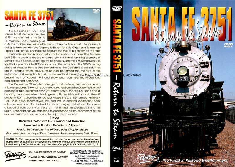 Santa Fe steam engine 3751 traveled over Cajon Pass on its way to Sacramento for Railfair´99 and Pentrex was aboard the train, on the ground, and in the air to show you this mighty locomotive from every angle. You´ll see spectacular views of Sullivan´s Curve, Mormon Rocks, the climb up to Summit, Mojave Narrows, and fast running across the high desert to Barstow. As you pace alongside the 3751 and hover over freight trains as they meet the steam special, you´re railfanning from the ultimate chase vehicle!